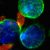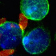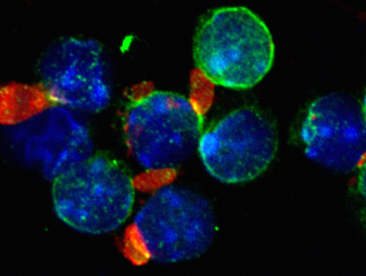 . FACS sorted murine B cells (green) in close contact with N. caninum tachyzoites (red). Credits Luzia Teixeira.